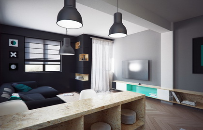 44)如果自己做饭菜少可以考虑开放式,如果比较多,还是封闭的比较保险,再好的吸烟机,也不可能把油烟都吸走,可以考虑塑钢门或玻璃隔断,能够大大增加采光。